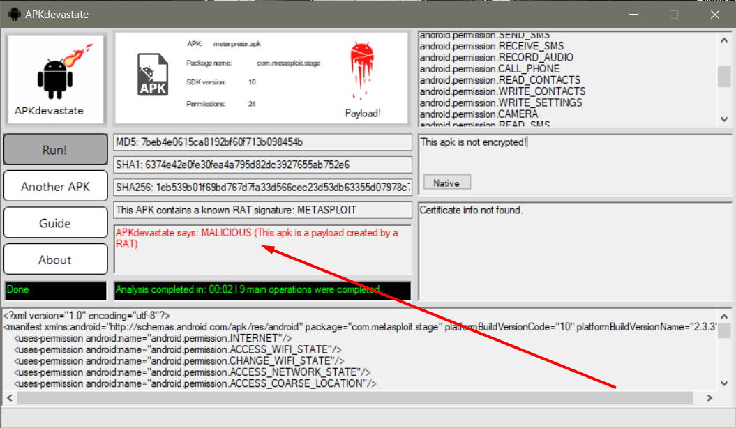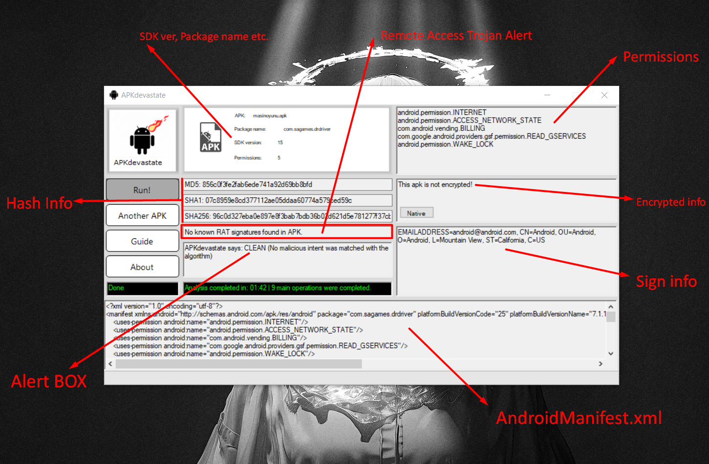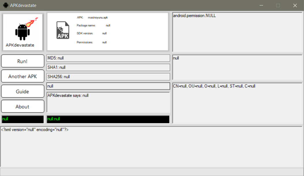 APKdevastate C# Proqramlaşdırma dilindən istifadə edilərək hazırlanmışdır və .apk payloadını hansı RAT tərəfindən yaradıldığnı bildirir.
