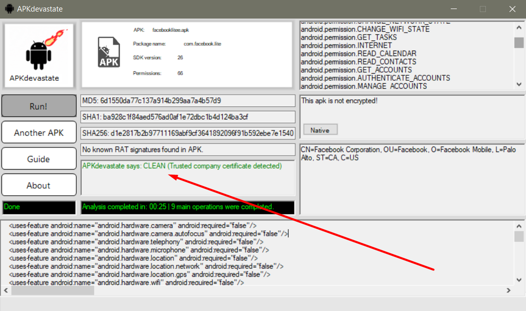 Indi isə gəlin birdə facebook.apk faylını proqrama daxil edək, görək bu səfər APKdevastate bizə nə cavab qaytarır.